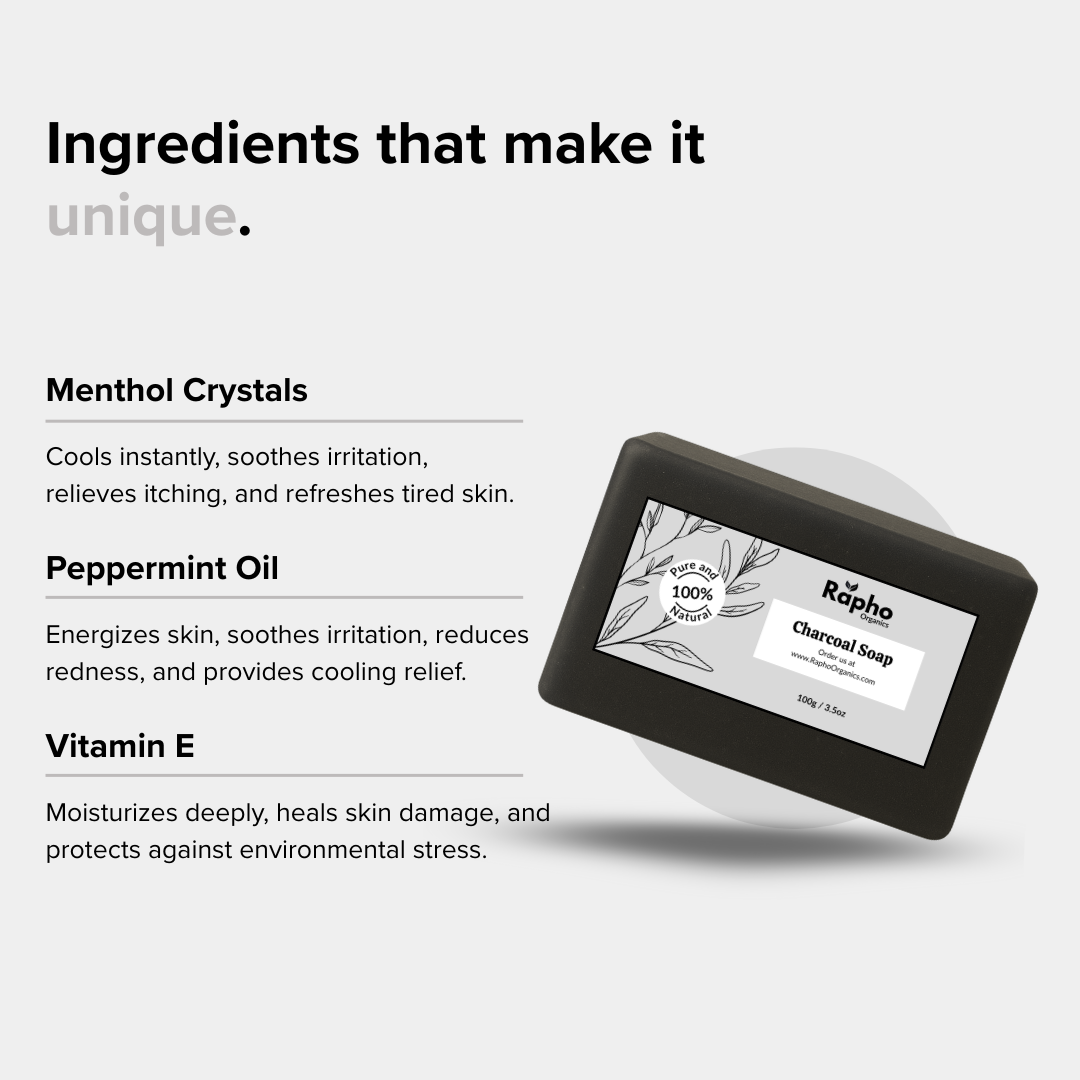 Detox and purify your skin naturally with our deep-cleansing Charcoal Soap. Infused with activated charcoal, tea tree oil, aloe vera, and vitamin E, this powerful formula draws out dirt, oil, and impurities while keeping the skin balanced and refreshed. Perfect for oily, acne-prone, and combination skin types.