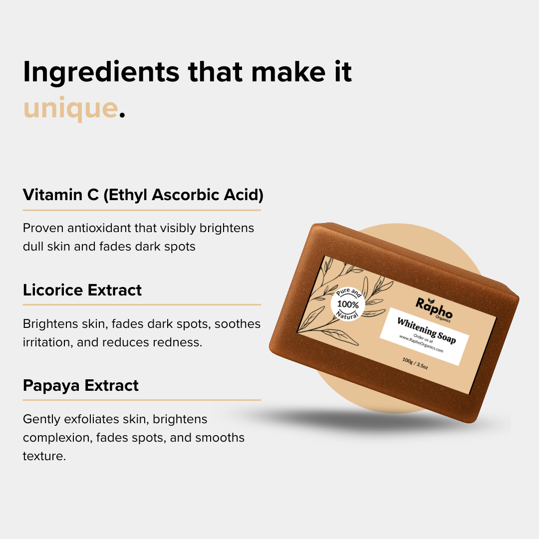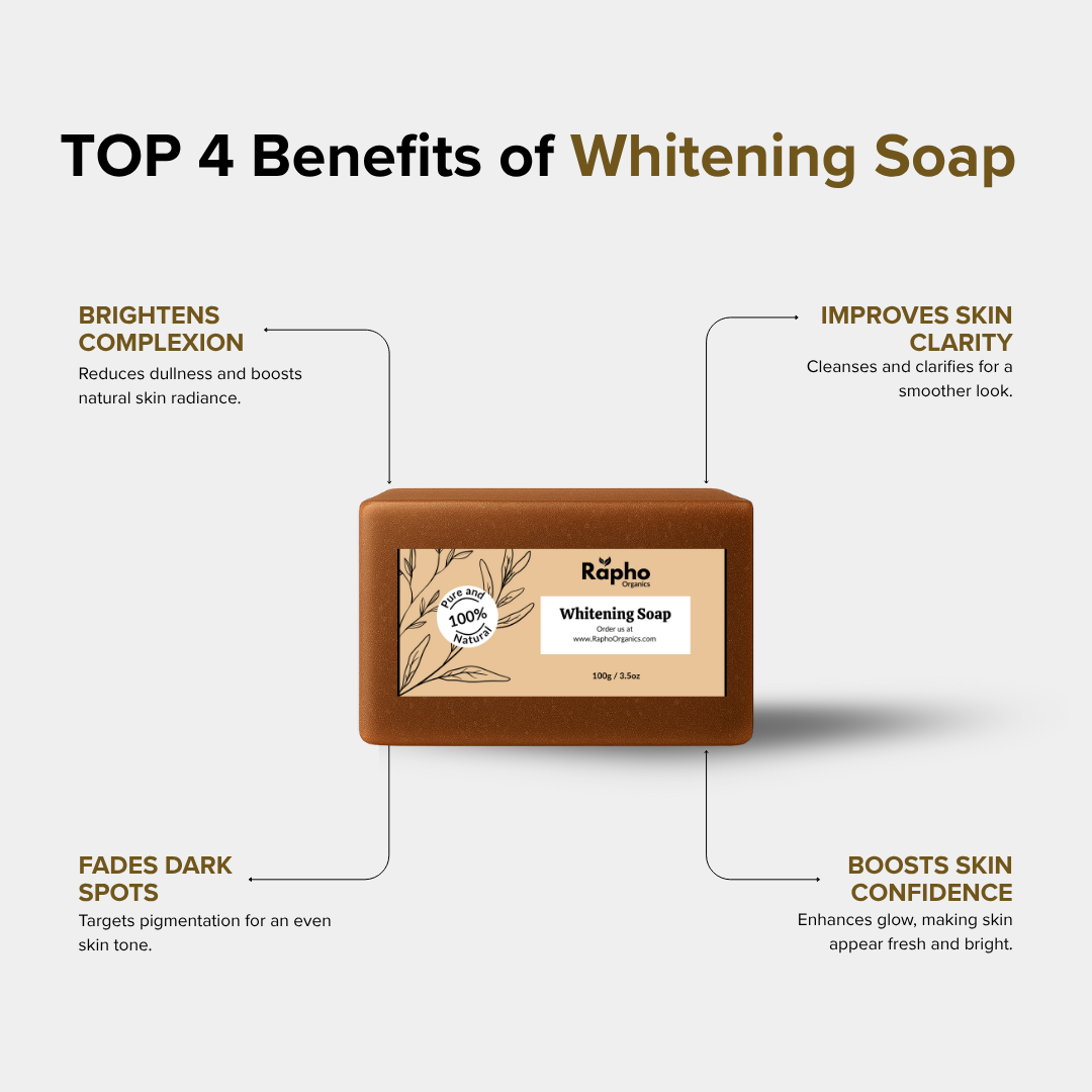 Achieve radiant, even-toned skin naturally with our plant-based Whitening Soap. Infused with Licorice Extract, Orange Peel Powder, Vitamin B3, Papaya Extract, and Vitamin C, this gentle yet effective formula helps fade dark spots, hyperpigmentation, and uneven skin tone—without harsh chemicals. Ideal for daily use on all skin types, including sensitive skin.